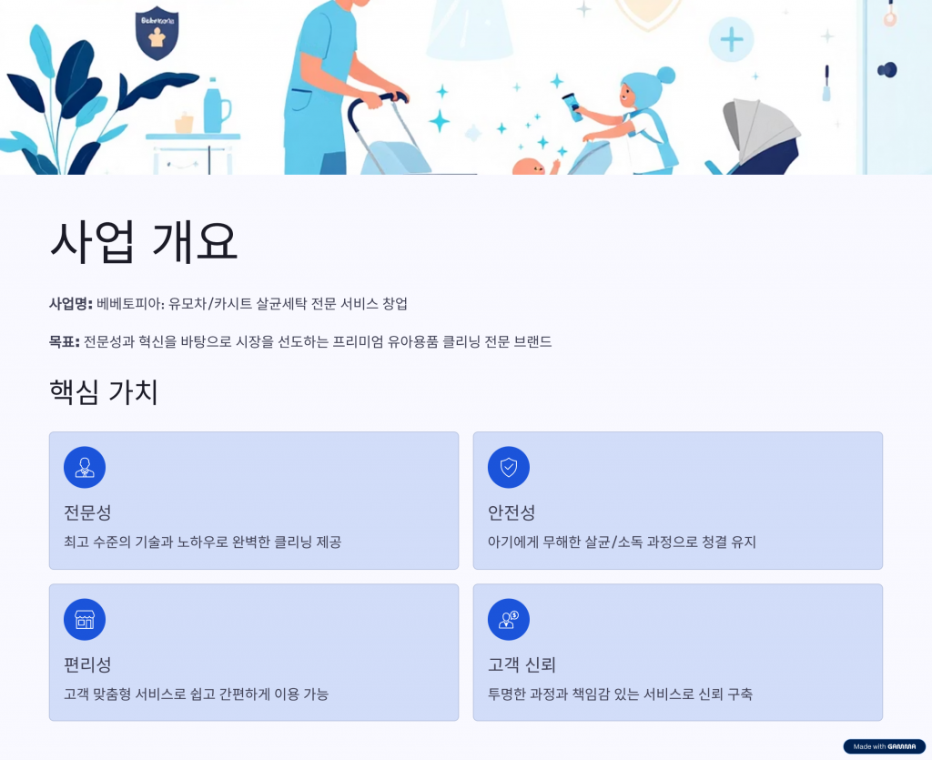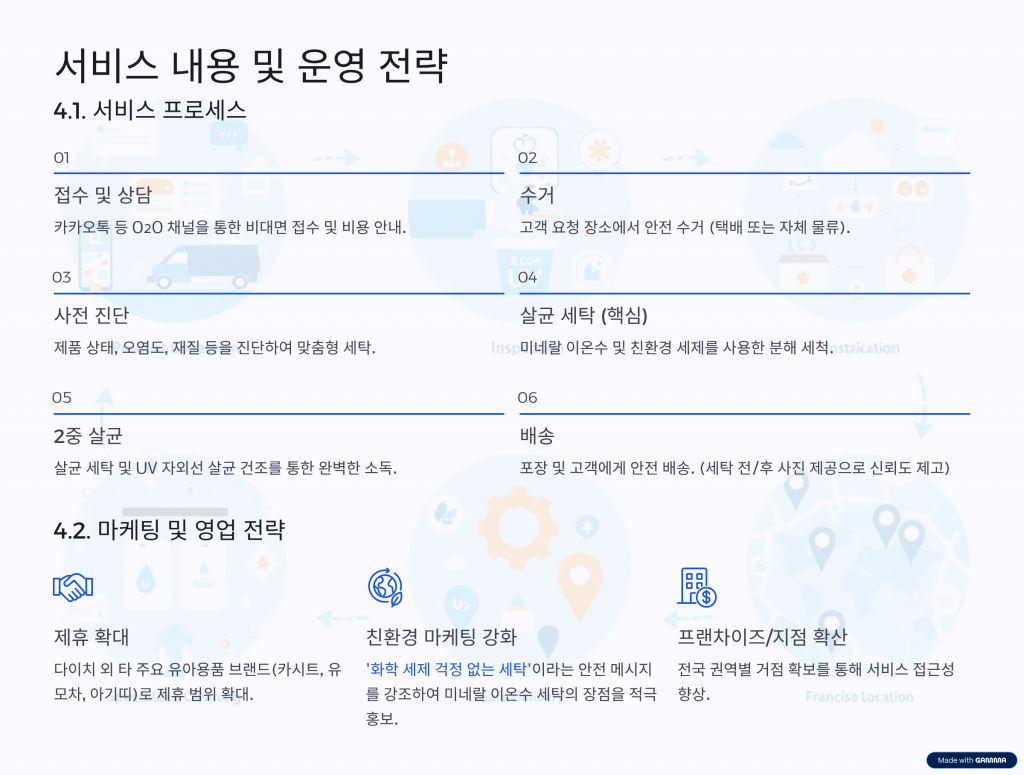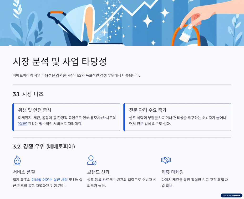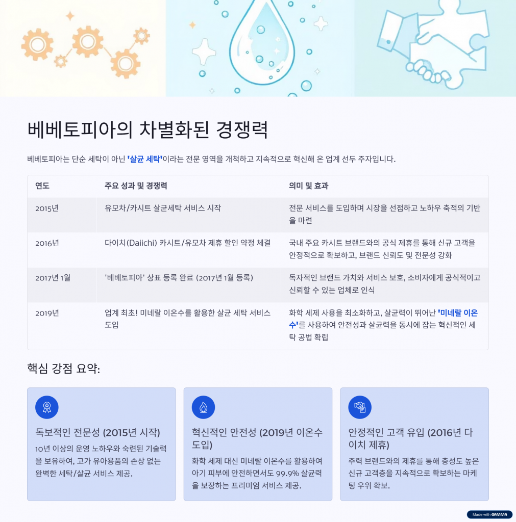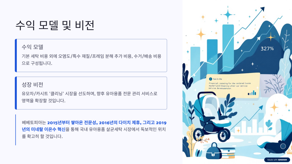 - 혁신적인 안전성 (2019년 이온수 도입): 화학 물질 대신 미네랄 이온수를 활용하여 아기 피부에 안전하면서도 99.9% 살균력을 보장하는 프리미엄 서비스 제공.